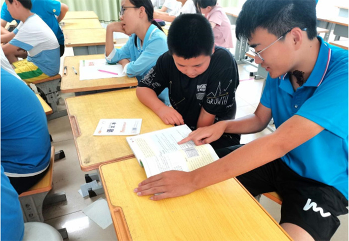 图为讲课的志愿者通过提问来查看学生对知识点的熟练程度。高鹏 摄