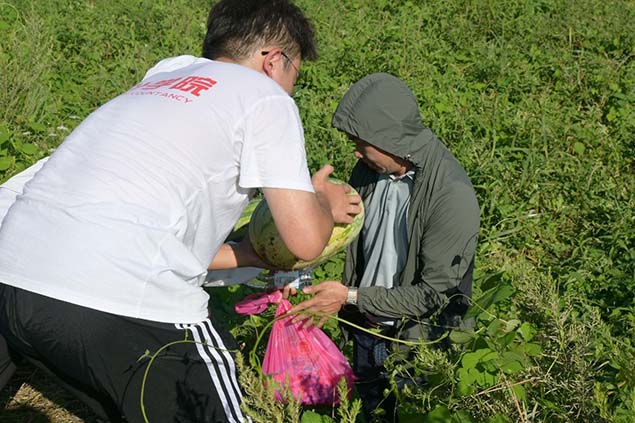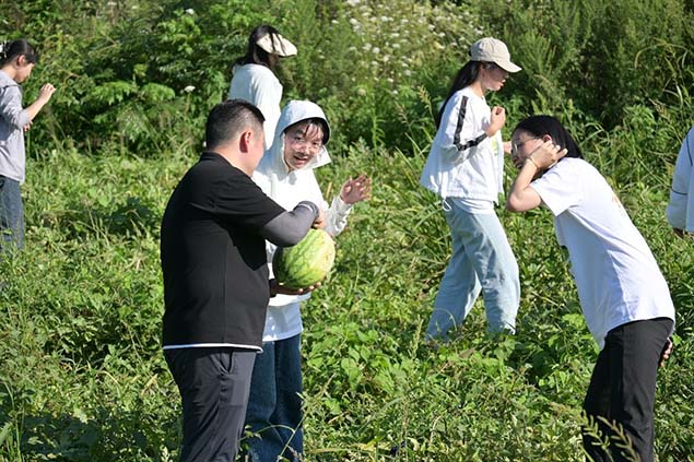 田主韩叔全程进行讲解说明,“现在正值夏日,是田间杂草疯长的季节,村里大部分家庭只有老人和小孩,因此也正是需要劳动力的时候。”团队队员躬身实践,通过实地观察,了解到玉米苗、大豆苗与杂草的区别,简单划分区域、明确分工后,共同在玉米与大豆田中开展除草劳动。在韩叔的理论指导和自身的亲身实践中,团队成员理论结合实际,总结了一套除草手法,大大提高了劳动效率。除草后,韩叔又重点向队员们介绍了判断西瓜是否成熟的方法,“看西瓜茎,根茎的细小绒毛都死掉了就是成熟了,就可以摘了!”步行十分钟后,韩叔演示了采瓜的过程以及注意事项,团队成员认真听讲、虚心请教,在劳动中亲近自然,通过切实地动手采摘、出力流汗,体验到寓于劳动中的艰辛和快乐,让劳动教育内化于心,外化于行。