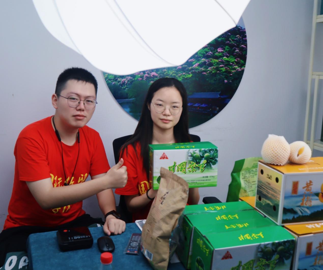 图为团队成员尝试为井冈山特产黄桃、梨子进行直播带货