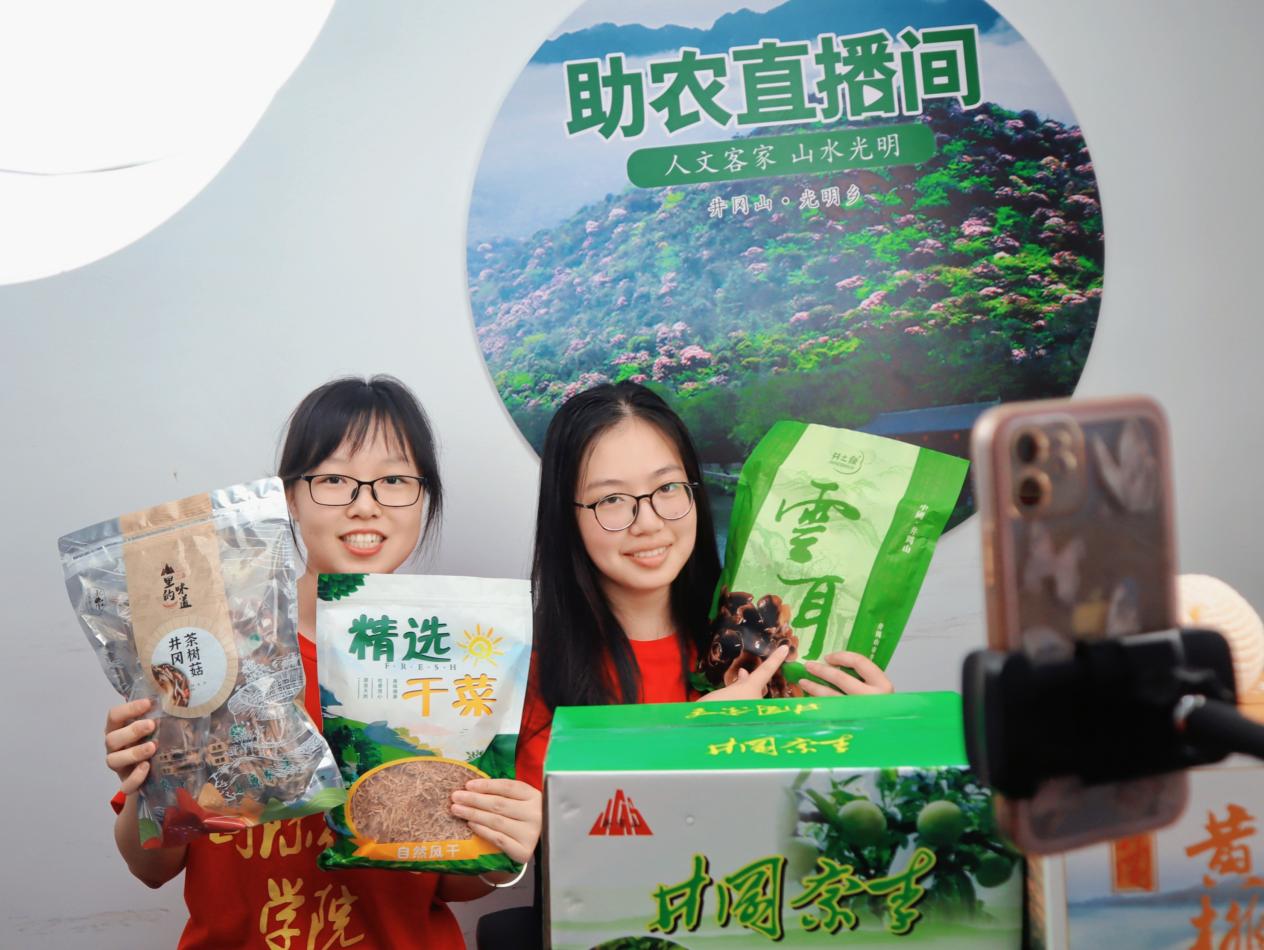 图为团队成员尝试为井冈山特产云耳、干菜、茶树菇进行直播带货