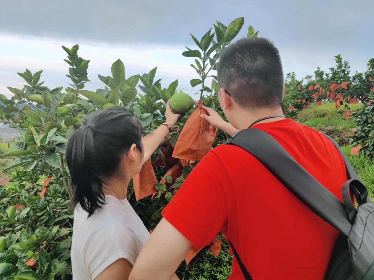 图为拿山镇果园工作人员为团队成员介绍“井冈蜜柚”