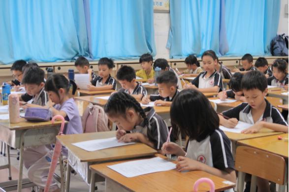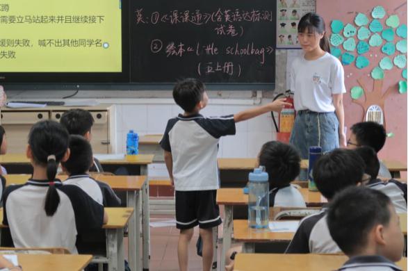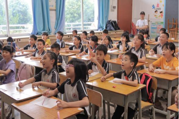 2023年7月17日,开营仪式结束以后,在华南师范大学物理学院团委学生会服务队教务组成员贾君怡和陈映吟的带领下,成长营一班的小朋友们一起来到教室里进行开班仪式。在开班仪式开始之前,服务队队长刘芷蔚对小朋友们进行了点名,被点到名的小朋友也积极回应,大声地喊“到”,非常的活跃热情。