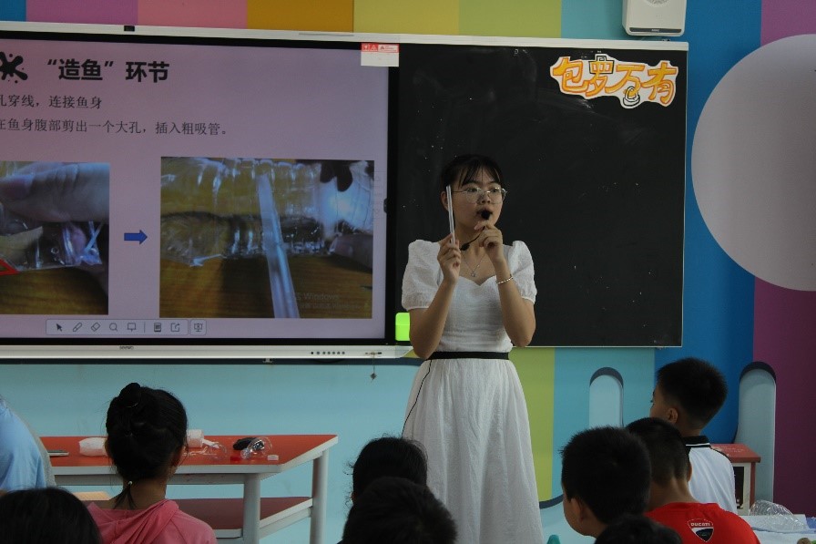 其二,为了加深小朋友们对中华传统文化的认识,更好地加强对顺德特色鱼灯文化的传承,华南师范大学物理学院团委学生会服务队策划组成员黄瑜晴在2023年星槎小学暑假成长营中为星槎小学的小朋友们准备了一节以“小小鱼灯来集福”为题的特色活动。