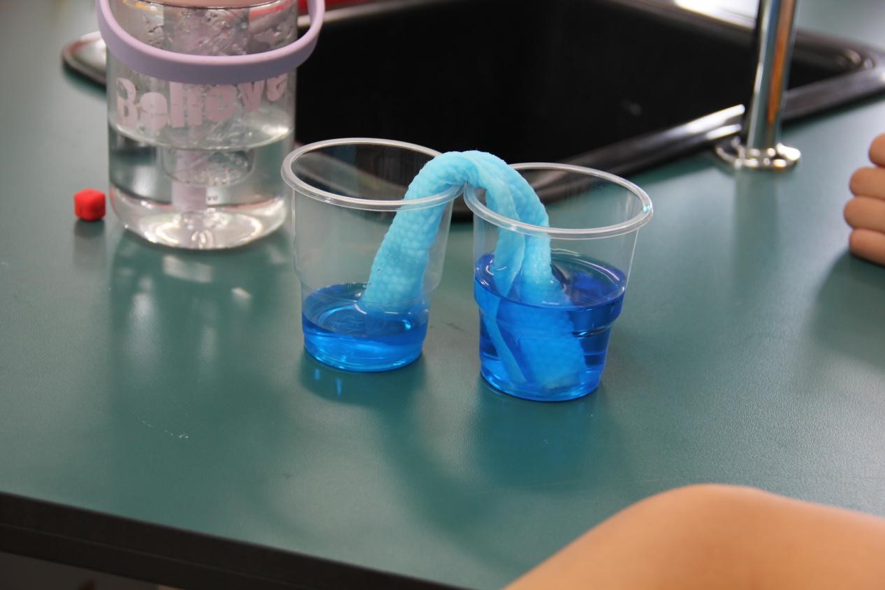 之后,陈远娴老师让小朋友们动手做“纸巾来送水”的实验,希望利用洗脸巾、色素与一次性杯子等常见的道具,向小朋友们直观展示毛细现象的过程。在实验中,通过滴加色素,小朋友们能够清楚地观察到洗脸巾中水分的运输以及一次性杯子中水分的积累,从而直观地感受到毛细现象对于水分贮藏和运输的影响。在实验完成之际,陈远娴老师向同学们提出“为什么在最后液面会相平,而不是一高一低”的问题,让小朋友们复习了压强的概念,加深小朋友们对科学知识的理解。