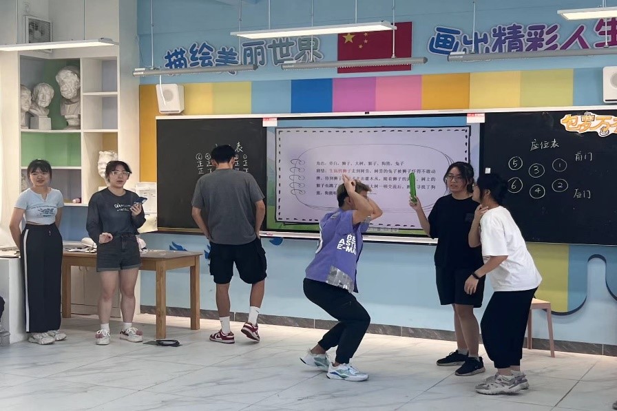 书写完剧本后,小朋友们很快的投入到了舞台剧的排练,导演的指示和助教老师的帮助都使得整个排练过程十分顺利,在不到二十分钟的时间里,很多的小组就已经完成了舞台剧的排练。