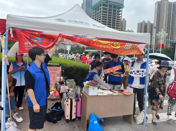 8月8日,实践队奔赴威海市环翠区威海公园进行反邪教宣传,在人多的景区、打卡点开展反邪教知识推广、宣传工作,在与当地城市管理服务岗位的工作人员沟通过后,很快就得到了支持与帮助,队员们齐心协力,向城市管理服务中心借来桌椅与宣传材料,通过在进出口必经之地设置固定摊位,发放反邪编织袋、反邪围裙、反邪小扇子等等物资及宣传册,将反邪之风送至威海。来自浙水院的反邪教实践小队联合威海市城市管理服务中心,对路过游客、社会弱势群体加强教育防范,以发放物资与“反邪小游戏”来吸引人们驻足,又在威海市博物馆、悦海公园等场所开展实践,担起青年肩上应承担的责任。