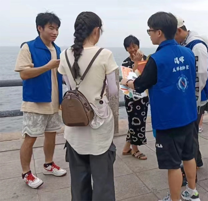 反邪教实践队队员们不断反思、学习,并对后续任务安排及发现问题进行讨论与总结,8月9日下午,前往半月湾、金海滩、海上公园等海边区域进行反邪工作,在炎炎夏日为人们送上反邪小扇子,带来阵阵清凉之余也将反邪教理念传递,海风吹拂带起阵阵浪涛敲打堤岸,即使天气炎热难耐,实践小队成员们仍能感到一丝慰藉。