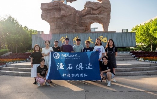 图为渔石俱进实践队在中国石油大学(华东)校内标志性建筑创造太阳处的合照。