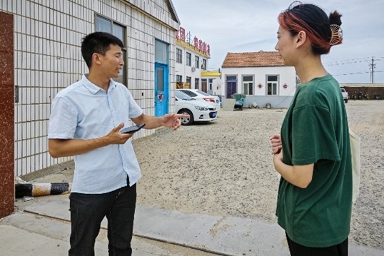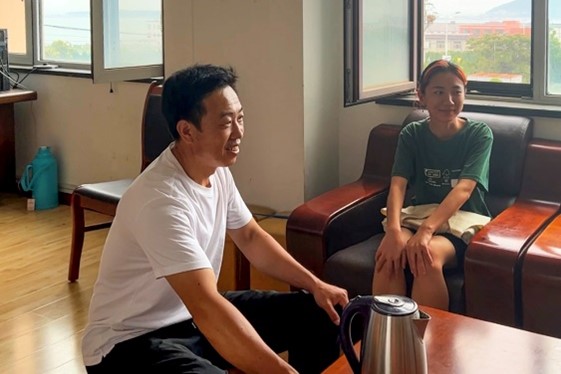 图为渔石俱进实践队队员石一曼正在对琅琊镇台西头村青岛龙湾船舶有限公司经理司品学先生进行采访,让我们更深入了解了渔民收入和船舶维修问题,并给出了宝贵的建议和看法。 孙小涵 摄