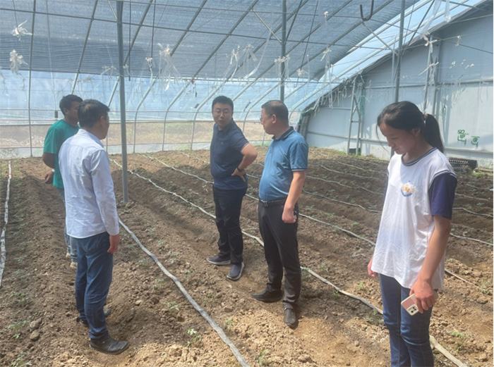 图为服务团队与当地农民实地考察大棚土地盐碱化问题