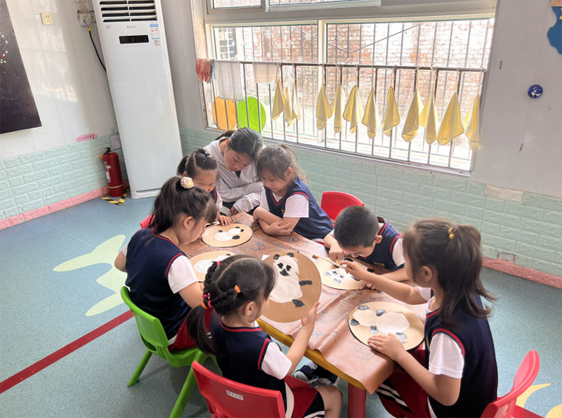 实践团成员指导幼儿进行熊猫的绘画,辅助幼儿进行绘画活动