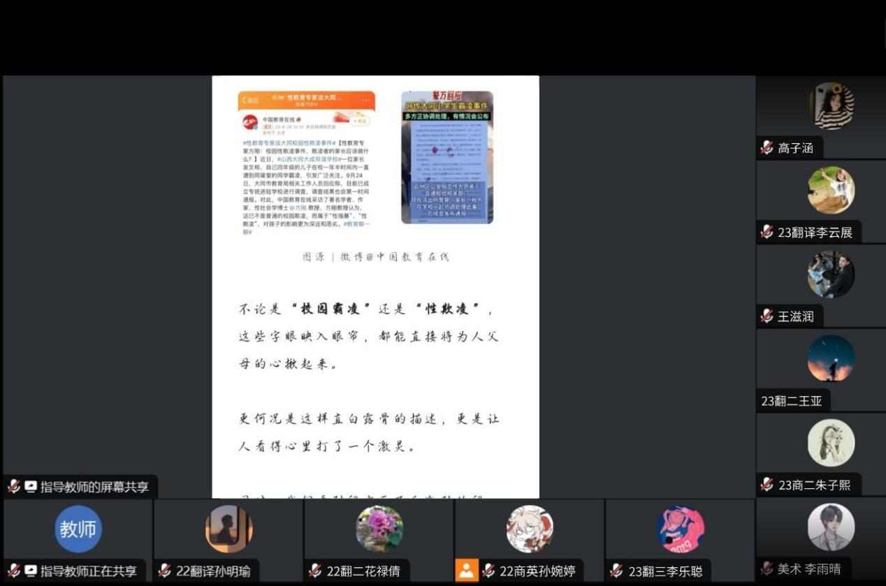 本次线上会议由队长孙明瑜主持召开,共15人参与。会议内容主要分为三部分。首先,实践队共同总结前期实践成果,互相积极交流分享实践过程中的感悟。在“大学生性教育宣讲”和“儿童趣味游戏全面认识性教育”两次实践中,团队成员们各尽其责,在活动中积极主动地去做好自己的本职工作,体现了良好的团队精神。实践活动也达到了预期效果,促进了性教育知识在青少年和儿童阶段的广泛普及。成员们在交流过程中发现,性教育并不仅仅是传授性知识,性教育是以“关系”教育作为前提条件的。于是实践队以近期热播青春教育电影《涉过愤怒的海》为探讨对象,会议展开第二部分。队长带领成员共同观看了该电影,大家感悟到家庭关系与父母教育也是性教育中不可或缺的一环。原生家庭是一个人最早接触和学习关于爱的地方,家庭中的亲密关系、父母之间的相处方式,以及对子女的教养方式都会对个人形成爱的认知产生影响,正确的教育观有助于子女健康成长,而错误的家庭教育则有可能使青少年产生错误性价值观,轻则危及自身成长,重则走向暴力与欺凌的道路。