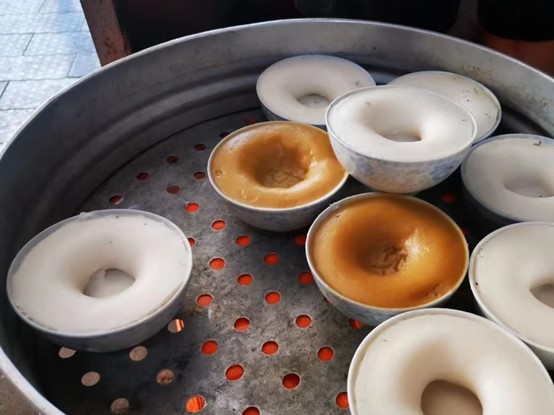 北海人喜吃米粉、薯粉制作的食品,统一叫做“籺”,北海发音做“ei”。籺的制法多种多样,可咸可甜可油炸,杯子籺是一款很传统的小吃,也是北海众多籺类中的一种。把提前制作好的米浆放到碗里蒸熟,晾凉后就可以吃了,看上去小小的一碗,却很顶饱。相传最早的时候是确实用杯子装的,后来改成碗了,所以也叫做“碗籺”,米浆蒸熟了之后,会在碗的中心形成小小的漩涡,因此也有不少当地人叫它“鸡窝籺”。