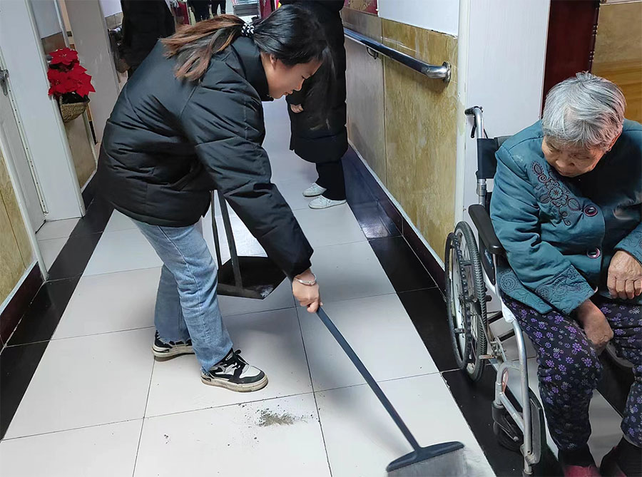 实践活动期间,实践团成员们与工作人员进行了详细的沟通,对老人们生活的基本情况和实践期间需要开展的工作有了深入了解。为保障老人们拥有一个干净整洁的居住环境,实践团成员们与工作人员共同开展大扫除,对走廊、休息区、餐厅等地区进行了清扫工作,将老年公寓的公共区域打扫的一尘不染。
