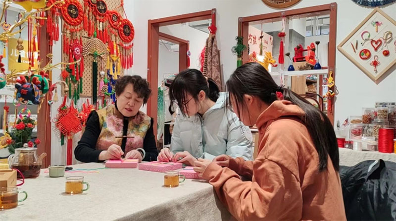 尹氏织艺:千年技艺的传承者在这个现代科技飞速发展的时代,传统手工艺的传承显得尤为珍贵。济南尹氏织艺是中国传统织染技艺的杰出代表之一,已有千年的历史。尹氏织艺源远流长,可以追溯到数百年前的明清时期。作为中国传统手工艺之一,尹氏家族代代相传,致力于传承和弘扬这一独特的手工艺术,尹氏织艺一直以其独特的手工织造技艺而著称,成为济南地区的代表性文化符号。实践队员首先跟非遗传承人尹崇芹老师取得联系,尹崇芹老师在基地内给实践队员介绍尹氏织艺的起源和自己第一次接触中国结的感触,社会实践队员沉浸在浓厚的文化氛围中,感受到传统艺术的深厚底蕴,感受到传统文化与现代设计相得益彰,形成了一种独特的文化氛围。工匠们不仅继承了祖辈的传统工艺,更是勇于尝试创新,将传统与现代完美融合,为织艺注入了新的活力。这一文化传承与创新共融的理念,也在尹氏织艺的产品中得以充分体现。