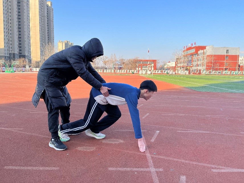 志愿者们讲述了如何以正确姿势进行起跑,并强调“良好的起跑姿势可以有效地利用身体的重量和肌肉的力量,从而在短时间内释放出更大的能量”。跑是田径运动的基础项目在中学体育教学与学生的体育锻炼中,跑是必不可少的内容。快速跑是初中主要教学容之一,跑也是体育课成绩考核的必测项目。孩子们的身体素质与能力存在差异,于是志愿者们据此对教学中的细节进行不断地修改和调整。在开始学习起跑姿势之前,志愿者们首先让孩子们演示出他们眼中正确的起跑姿势,孩子们热情高涨,激情讨论,并纷纷说“你的这种动作不对,我的才是正确的”。稍后实践队成员为孩子们示范了两种常见的起跑姿势,即蹲踞式和站立式,并突出两脚之间的距离、手指位置、身体重心等几个方面对于起跑的重要性。在进行动作示范的同时,对每一个动作进行耐心的讲解。询问孩子们是否掌握后,再进行起跑姿势的练习,有的孩子初次了解到这些,所以掌握起来比较难,志愿者们用手护住孩子们的身体,慢慢地将其身体重心调整到合适位置,并调整孩子们的双手位置,以手掌平放在起跑线上,手指间保持适当的间隙,以便提供更好的支撑力。在学习完这些以后,志愿者们进行的总结,也鼓励孩子们多多进行体育锻炼。