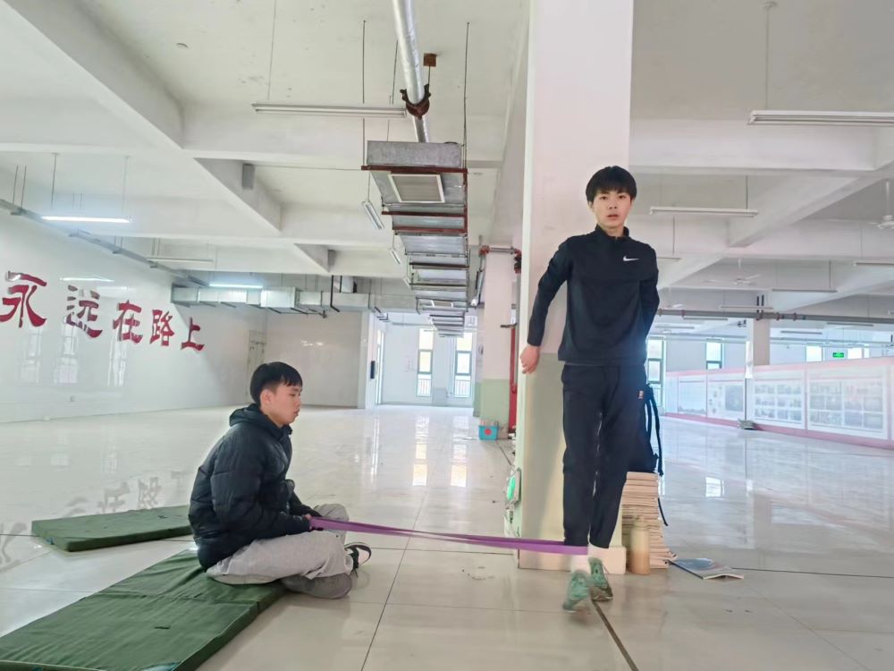 实践队员为了进一步在技术方面提高学员成绩,在练习其他大肌肉力量的同时,也积极进行了小肌肉群力量的练习,图中为了向学员们讲解示范,挑选了一名学员为大家讲解示范。在这个过程中,通过橡皮带这种工具捆绑在学员脚踝上,向学员们展示了练习方法和动作规格,使学员们在练习中更加的通俗易懂。学员们通过小肌肉群的练习,提高了小肌肉群力量的爆发力,在体育成绩上更加的突飞猛进。