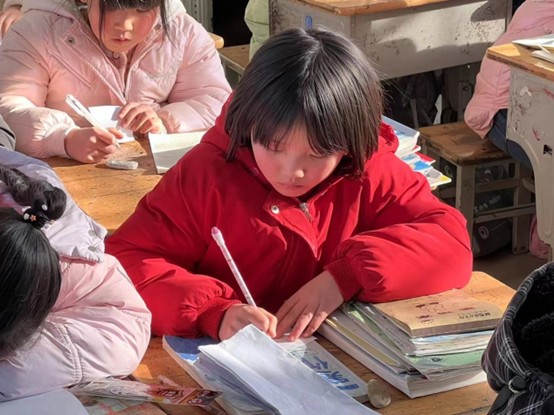 折纸课上,山东大学电气工程及其自动化专业的大一学生刘双凤作为折纸老师,正在环视整个教室,给四年级的小朋友们一一提供帮助,教学折眼镜、帽子、千纸鹤等有趣的小物件,但她注意到了最前排的一个小男生,在其他同学兴致勃勃的翻折手中的卡纸时,他却坐在座位上双手插兜保持不动,折纸老师刘双凤表示十分好奇,“说实话,那时,我以为那位小朋友是对折纸不感兴趣或者跟不上折纸步骤,对他也就多加留意了一些,但我没想到,他下课后找到我,怯生生的小声询问我,老师,下节课能教一节不用动手的课吗,手冻得太冷太疼了。说完我就看见他手上长满触目惊心的冻疮的伤口,那时,一想到这的小朋友们在以往乃至以后的漫长时光里都要在这样的严寒中刻苦学习,心里真的不太好受,希望未来他们都能用努力浇灌出梦想的参天大树。”随着担当助教的管理学院大二学生明傲天老师的一声高喊“同学们,你们的眼镜折好了吗?快举到高处让老师看到!”小朋友们的灿烂笑容在相机中被永久定格,小朋友们的双眼泛着熠熠光辉,仿佛美好的未来已然向他们招手。