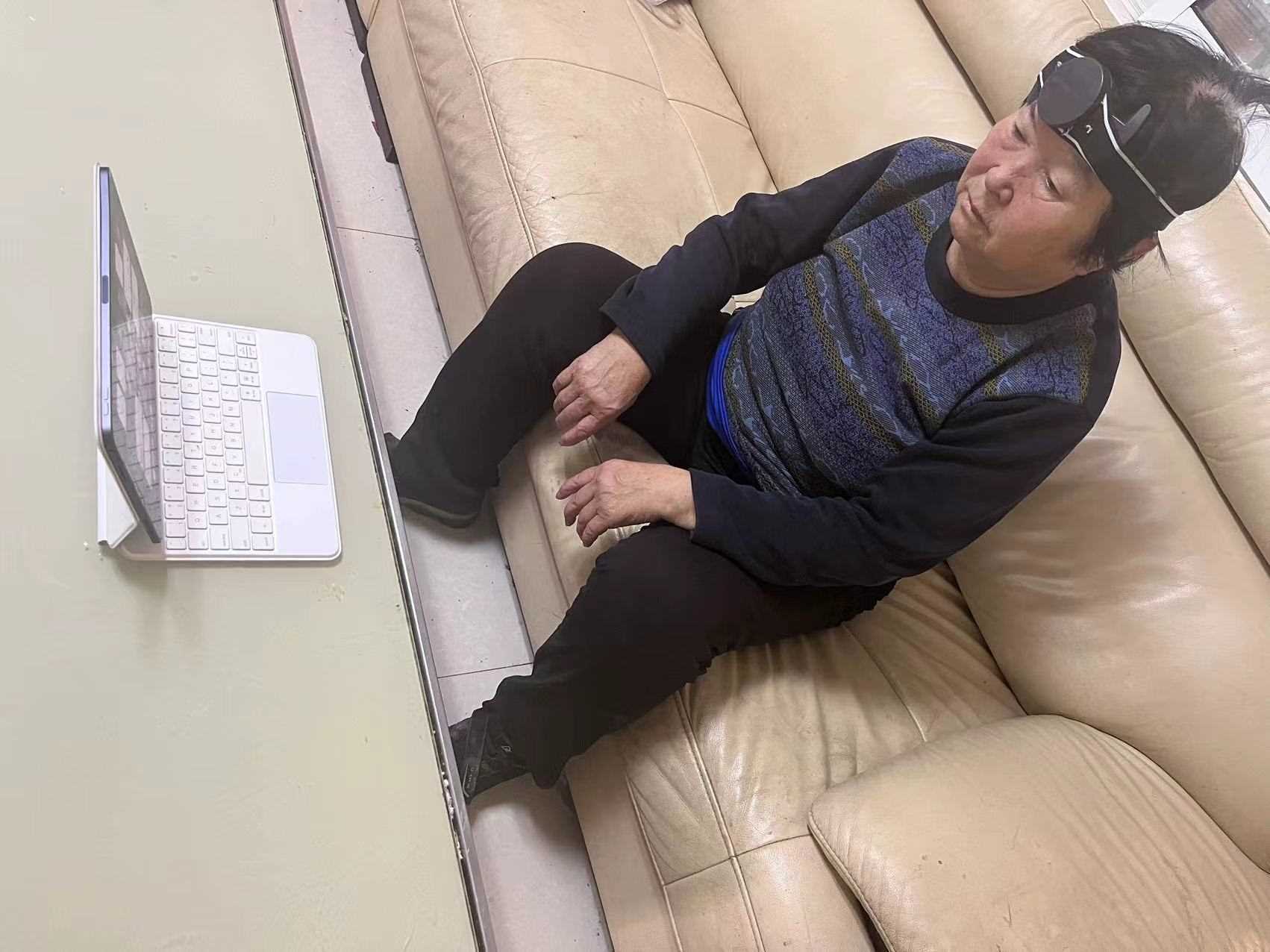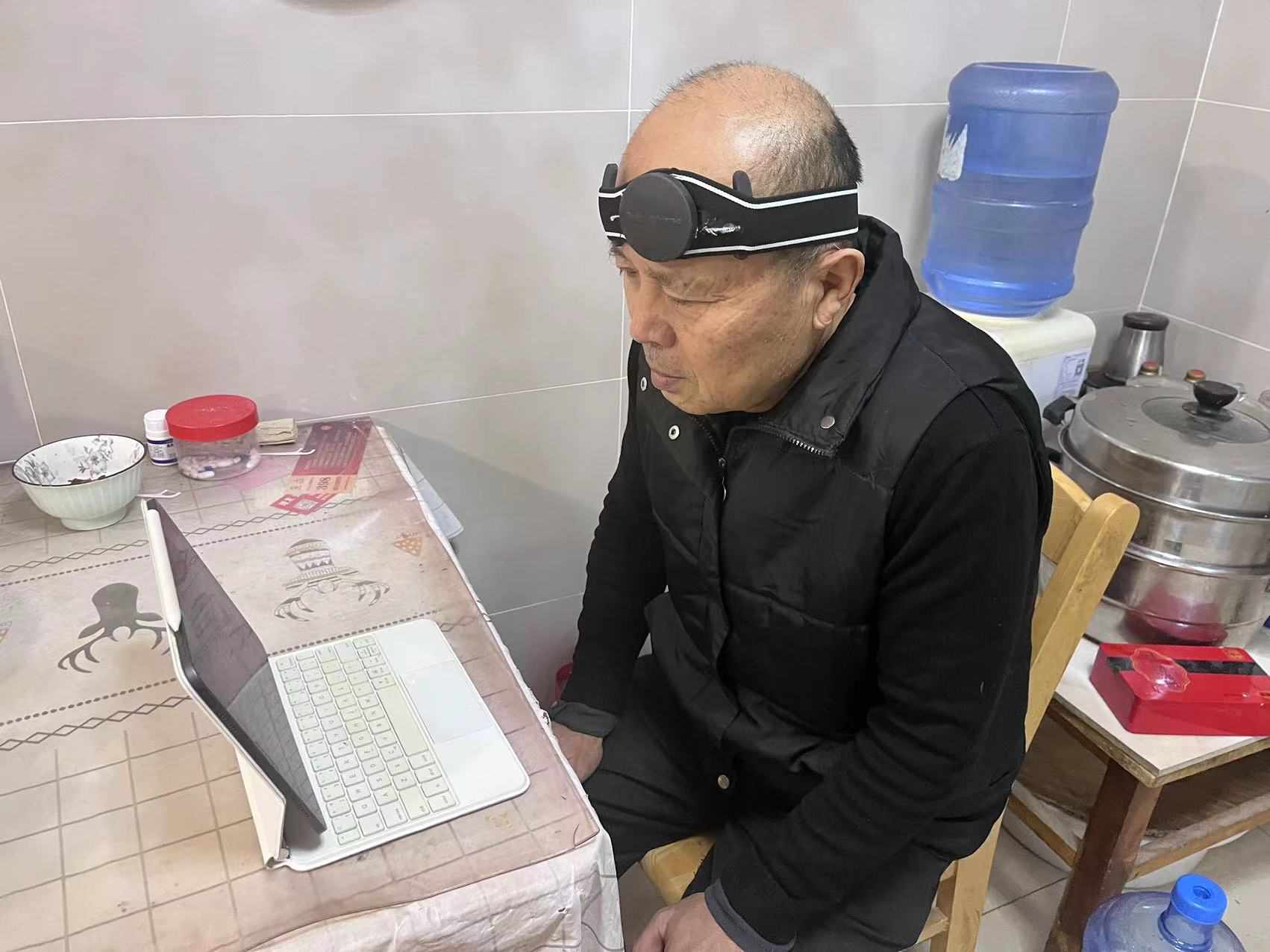 调研之始,团队主要参观了医院康复科,了解了失能老人的日常生活安排,包括其居住环境、日常活动和使用的辅助设备。其中,脑损伤患者王先生自述自己在一年多前因车祸导致脑部受损,尽管经过手术和康复治疗可以实现行走,并做出简单的动作,但其语言表达和肢体协调功能仍有待改善。在脑机设备试戴过程中,王先生体验了脑机通过游戏锻炼手部协调能力等功能,对脑机接口技术恢复患者日常生活能力的作用表示肯定。