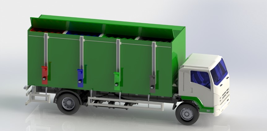 二是设计可自调控的智能垃圾分类运输车。现有的垃圾运输车为带有升降装置的单车厢式垃圾运输车,然而由于每日垃圾产生数量有差异,通常需要考虑垃圾车的分配问题。我们设计了一种可自调控的智能垃圾分类运输车,可以动态调节四个车厢的大小,做到一车清理四种垃圾,解决由于每日垃圾产生数量的不同造成的浪费现象。