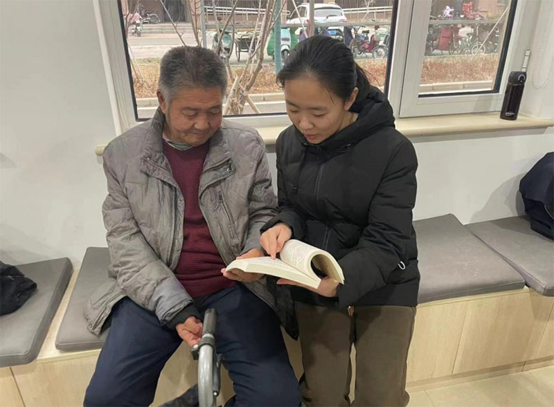 在收拾卫生的时候,志愿者们整理到书架的时候看到了《习近平著作选读》,想到给老人们讲述了新时代的发展理念,并且也向他们请教了毛泽东领导时期的发展的经历。同时让志愿者提高了自己的知识,也有了不一样的认知与看法。