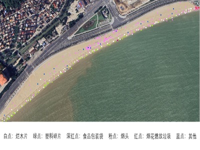 调查中发现烟头垃圾在沙滩上分布广泛,数量较大,这可能是因为游客习惯性在沙滩上吸烟导致。而烟花垃圾则相对集中,主要位于沙滩最末端,其中包括一些细小的木棍或小圆形的烟花包装。这提示了可能存在特定的烟花废弃点,需要引起关注。