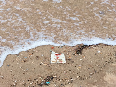 调研伊始,团队成员来到了广东省珠海市唐家湾海水浴场,对当地沙滩的污染情况展开了实地调研。在团队成员的走访之下了解到,唐家湾海水浴场沙滩的垃圾种类相对较少,以颗粒小、质量较轻的塑料碎屑、木头碎片等为主,包括短塑料绳、塑料包装碎屑、烟头、烂木头、食品塑料包装、瓶盖、燃放完的烟花垃圾等。对于这些塑料,工作人员介绍道:“这里的塑料垃圾有很多时候是海浪带上沙滩的。”珠海岛屿众多,码头也多,不少渔民将废弃的塑料薄膜和塑料捆扎绳直接丢弃在海上,海水运动再将这些垃圾带上海岸。当然也不乏有游客乱丢垃圾。但是在当地红衣志愿者的清理下,沙滩垃圾总量并不多,环境治理情况相当不错。