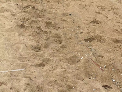 调查伊始,团队成员白沙门沙滩及其附近海域的垃圾污染情况及垃圾种类分别进行了实地调研。沙滩洁白,海不扬波,该片海域的沙滩垃圾较少,整体比较干净,而且并没有看见环卫工人在清扫垃圾,有专用的垃圾桶进行收集垃圾,可见当地居民和游客的素质是整体比较高的。沙滩整体平整,但海边部分下陷严重,基本无植被覆盖,但有部分岩石。岩石部分有一些不明丝线,但无其他垃圾。垃圾主要出现在沙滩上,沙滩上的垃圾种类主要是烟头、烟花爆竹残骸和包装纸、口罩和纸屑等一些细微垃圾,还有见到一个矿泉水瓶和一个大纸壳,但大型垃圾出现很少。