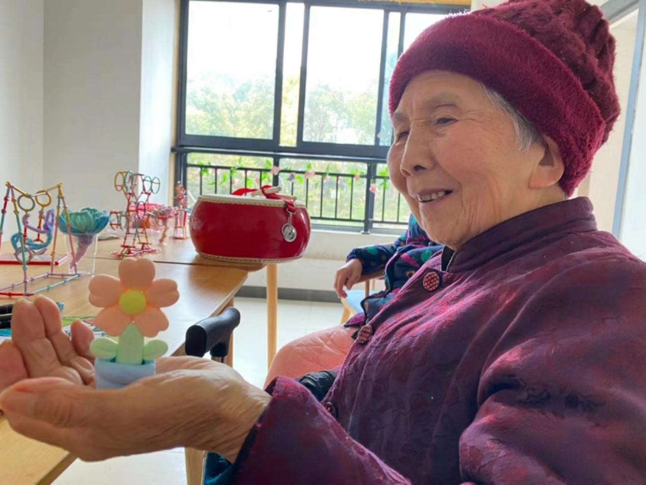 图为敬老院老人向实践队员展示自己的手工作品。 通讯员程莉娜 摄