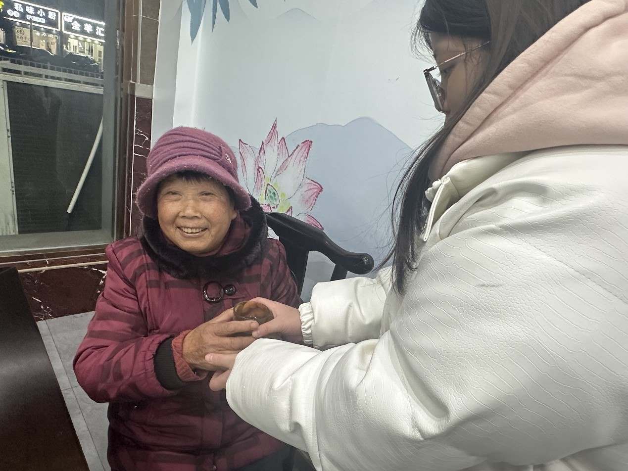 图为实践队员为老人递上热茶。 通讯员姚敏敏 摄