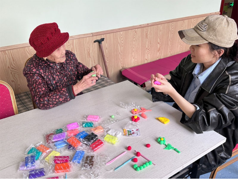 志愿活动第五天,志愿者们带上提前准备好的物品材料,与爷爷奶奶们一起做手工,向老人家们安利可爱有趣的“小玩意儿”,老人们好奇的眼神让大家更投入其中,气氛欢乐和谐。