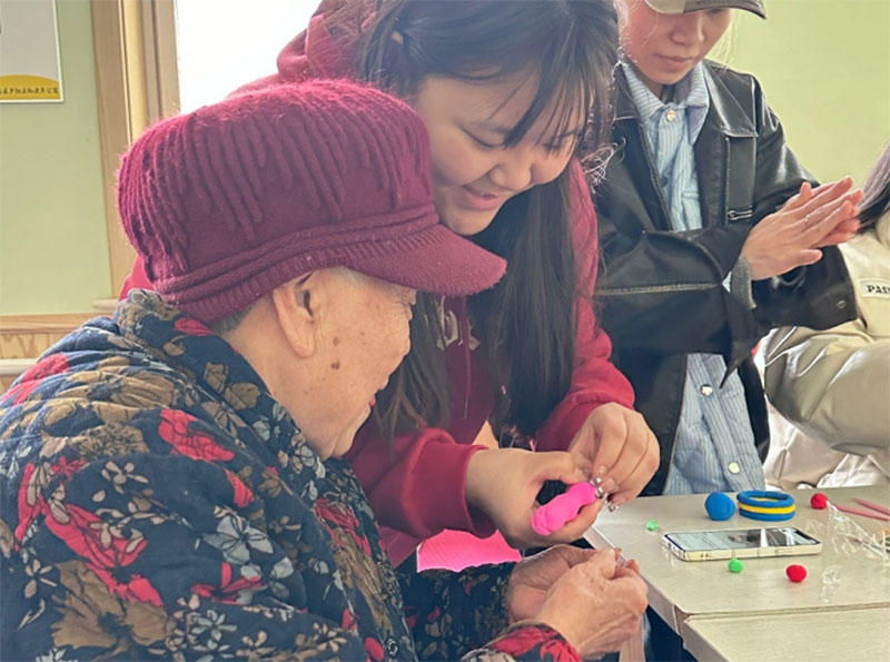 “花开半夏”实践团成员和老人一起完成欣赏手工