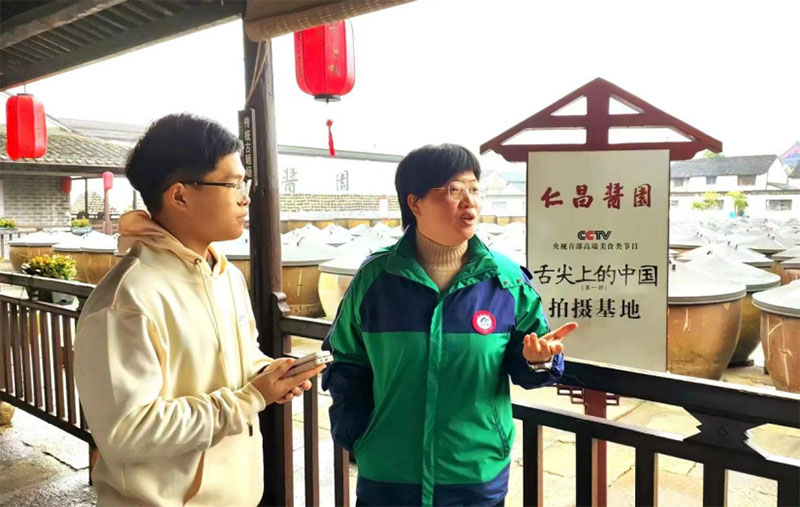 2月2日,实践队队员在安昌古镇采访仁昌酱园有限公司董事长俞彩玉女士。刘骁航 摄