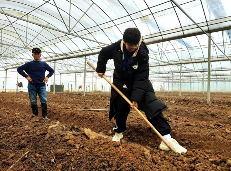 2月6号,实践队队员帮助当地农户翻耕土垡。翟重庆 摄