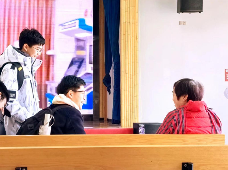 1月31日,实践队队员在枫源村文化礼堂采访村民。辛悦 摄