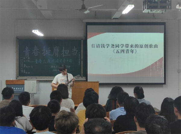 此外,钱学尧同学的原创歌曲《五四青年》以其优美的旋律和深情的歌词,传递了青年的活力和爱国情怀,赢得了在场团员的热烈掌声。