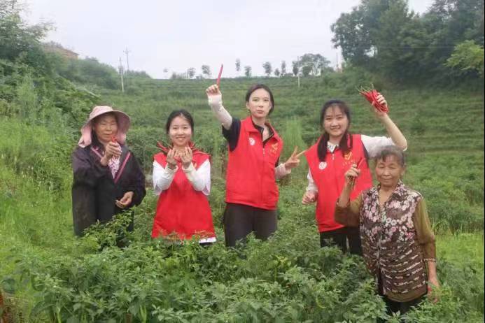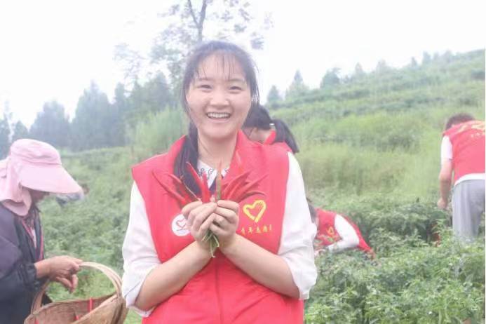 采访结束后,实践团成员全体出动至辣椒田,投身农耕,学习选品技巧。前夜的雨水让地里的泥土变得松软湿滑,沿着蜿蜒小径穿行其间,志愿者们不时停下脚步,仔细观察辣椒的生长情况。在两小时的采摘劳作中,志愿者们将采摘的辣椒装满一篓篓篮子再一框框背到马路边装袋。当地椒农还分享到,二荆条辣椒除了可直接做配料外,还可以加工成辣椒干、段、粉、酱,可以说家家都有豆瓣酱、泡海椒。在这片示范片区,志愿者不仅看到了乡村振兴的希望,更感受到了农民们对土地的热爱与坚守。