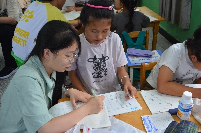 课程结束后,支教团队继续为学生们提供作业辅导服务,每张桌子都有团队成员耐心解答学生们的疑问,直至放学。
