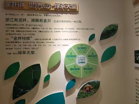 金井镇作为世外长沙绿茶天堂,其绿茶制作技艺被列入“湖南省非物质文化遗产名录”。在与展览负责人沟通交流中,团队队员得知,金井茶业培养了20多名非遗传承人,通过对产业模式的不断改良,茶叶成为金井镇的支柱产业。队员肃然起敬。