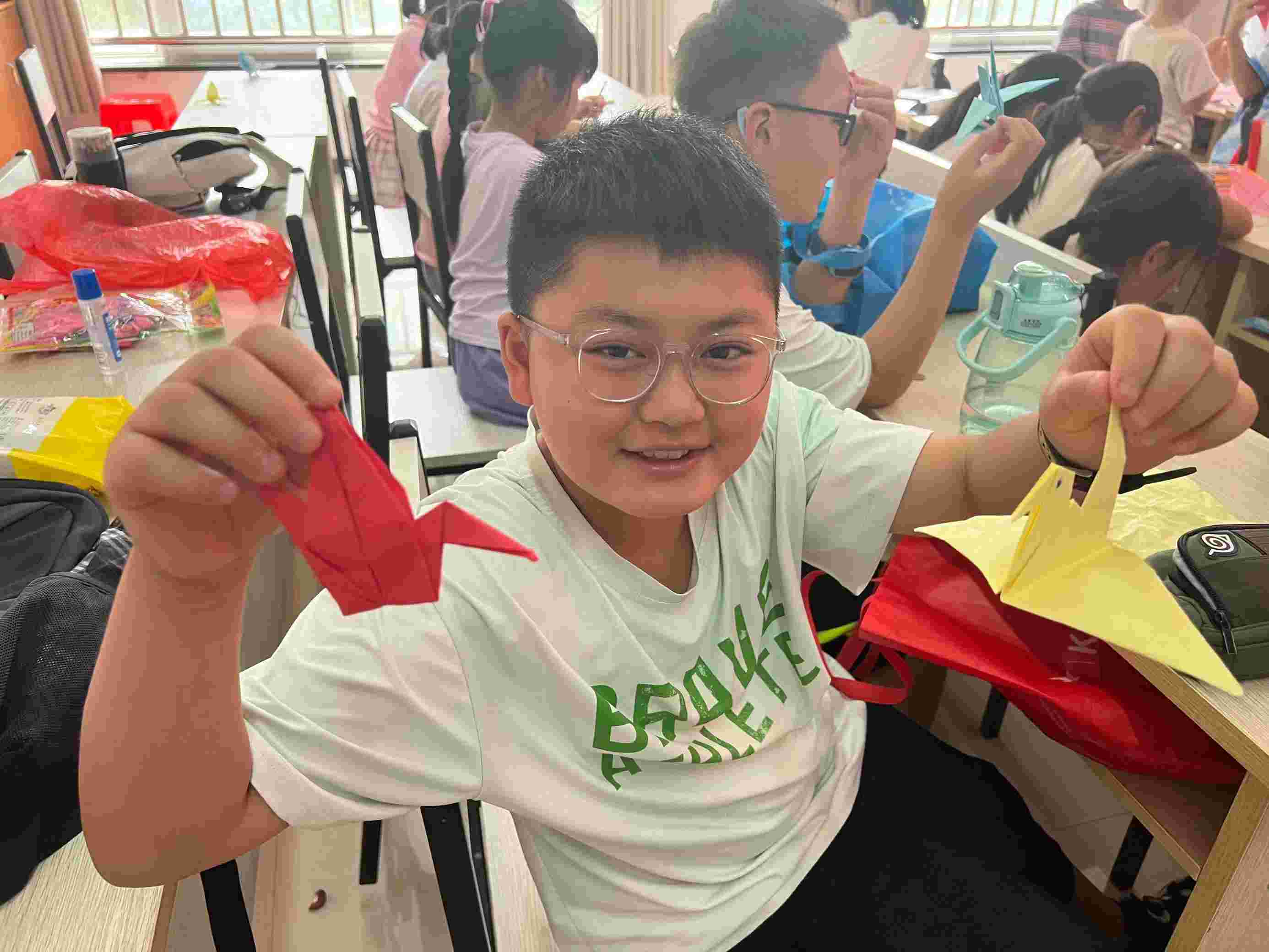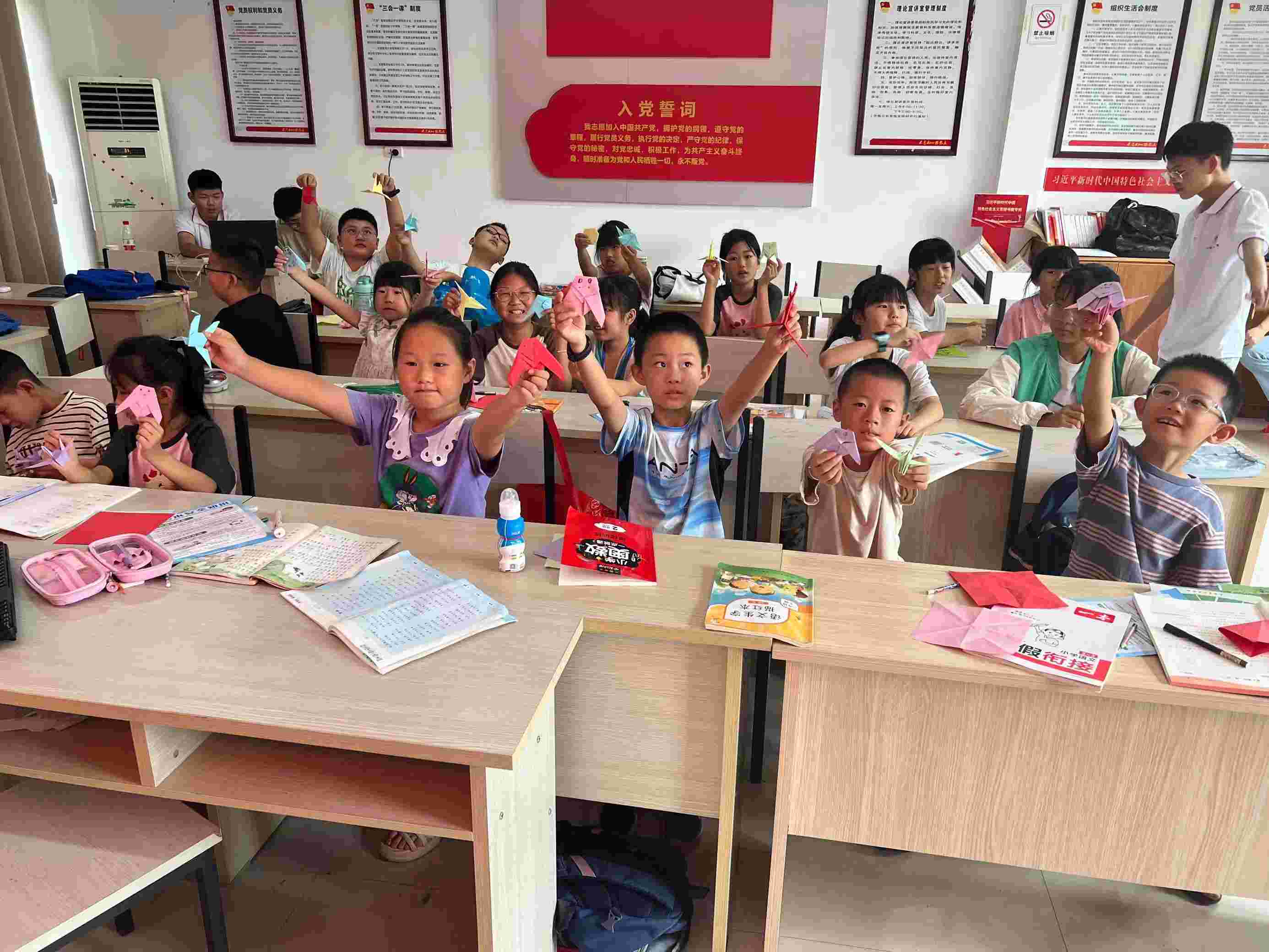 经过一节课的学习,实践团成员为了让学生们快乐学习,培养学生们的手工能力,教学生们如何去做折纸,遇到了不会折纸的学生,实践团成员也在细心讲解。实践团成员教学生们折了千纸鹤,知了等,一些学生会把他们折出的千纸鹤给实践团展示,向实践团分享自己折的喜悦。