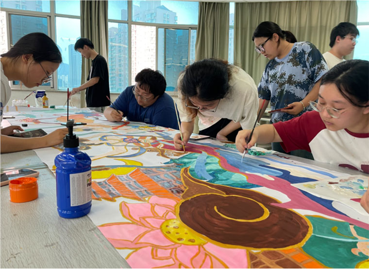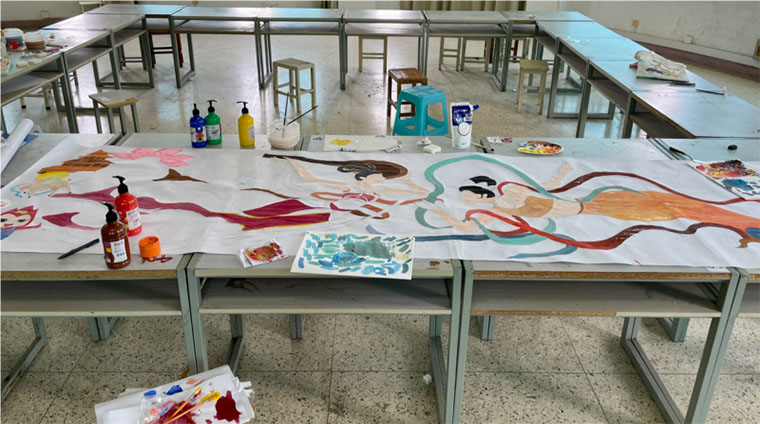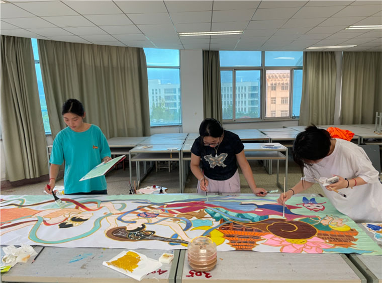 7月2日下午,“东方奇境,海上敦煌”长卷绘制在江苏海洋大学艺术楼401开展长卷绘制实践。本次暑期社会实践活动的首个重要环节,参与长卷绘制的同学们共同进行了敦煌壁画与海洋元素相结合的长卷创造绘制。此次活动旨在通过绘画这一艺术形式,深入探索并展现敦煌文化的独特魅力,让参与者们亲身体验到敦煌文化与海洋结合的艺术风采。