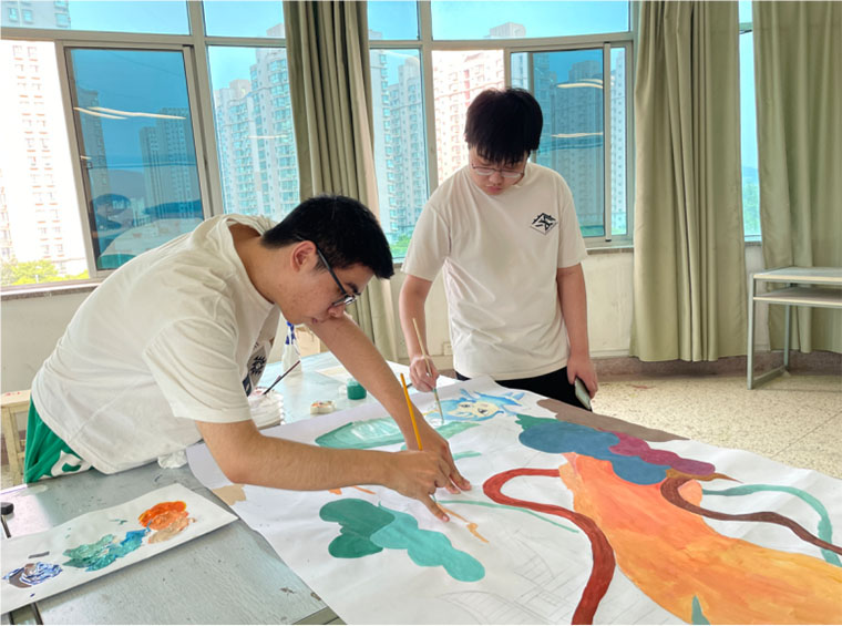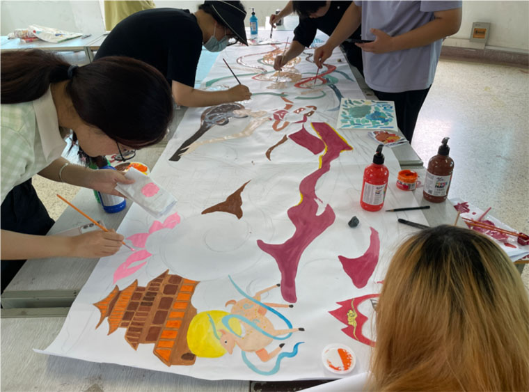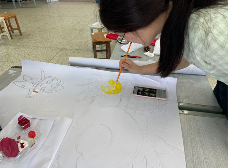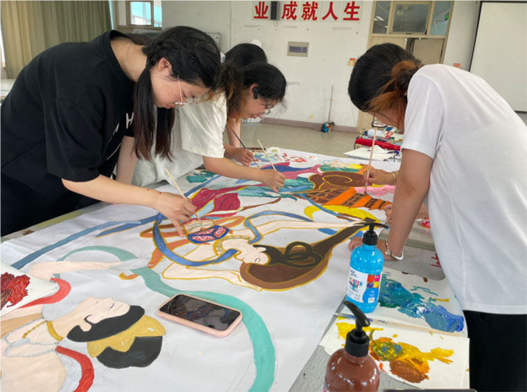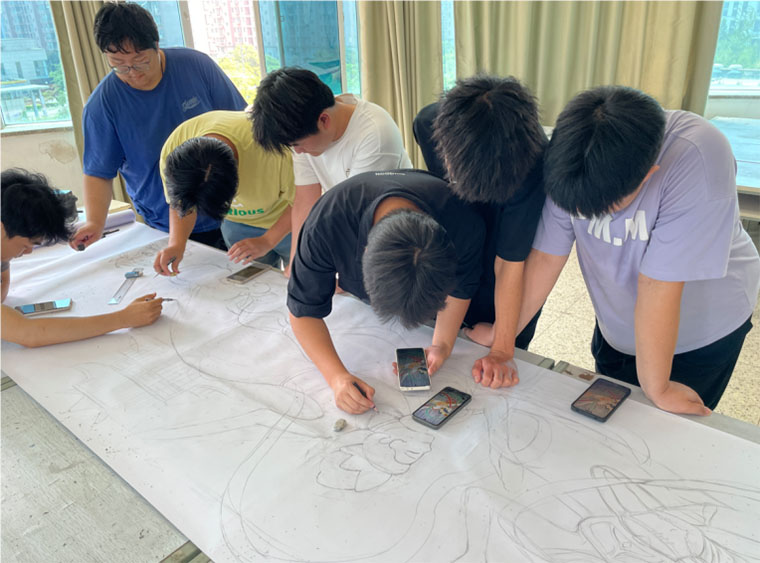 第一天进行了一下午的绘制后,同学们完成了线稿的绘制,以及部分人物的填色,过程中,同学们按照小组合作的方式轮流进行创作绘制。