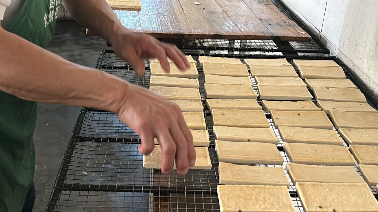 随后,彭继红女士带领我们走到工厂参观火烤豆干制作工程。彭氏火烤豆干工序复杂,要经过筛、泡、滤、烧、卤、拌、烤等步骤,制作火烤豆干最关键的步骤就是火烤,用玉米芯代替原来的松叶和柏木作为火烤燃料,再加上各种香料香草一起烘烤,而具体烤制时间、豆干翻转换位、火力大小把握都全凭经验。开炉的瞬间,香草气息随蒸汽上涌,烟雾缭绕中映射的是一代又一代人离不开的故土情怀,这也是非遗传承人们所坚持的初心。
