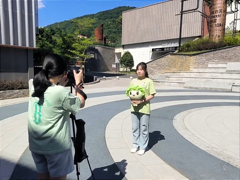 图3为实践队成员录制英文解说视频的工作照参观结束后,实践队队员充分发挥英语专业优势,精心制作了一系列高质量的英文宣传视频。视频中,队员们巧妙地融合了详实的历史资料与生动的现场叙述,用流畅而富有感染力的英语介绍了龙岩洞的工业历史背景及在生态文明建设中的转变与成就。此外,实践队队员们还在龙岩洞公园周边地区进行了广泛的入户宣传活动,通过发放宣传手册、志愿服务等形式,让更多龙岩市民关注龙岩洞的保护与开发工作。