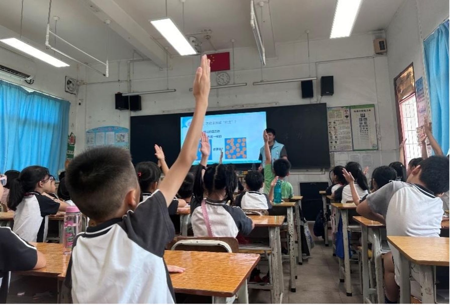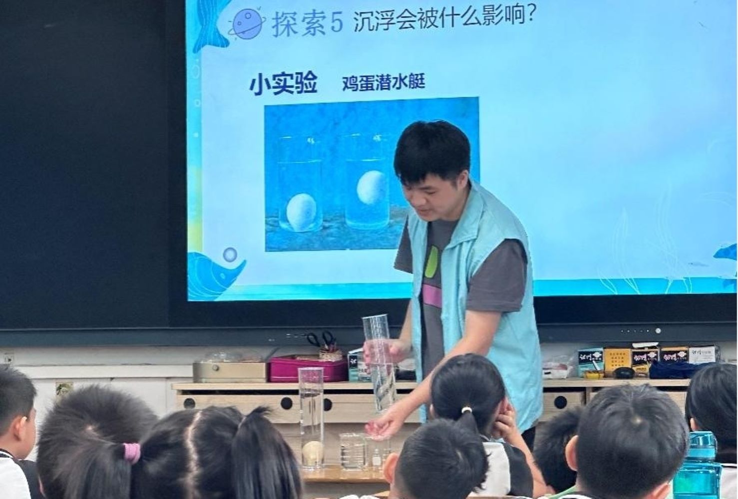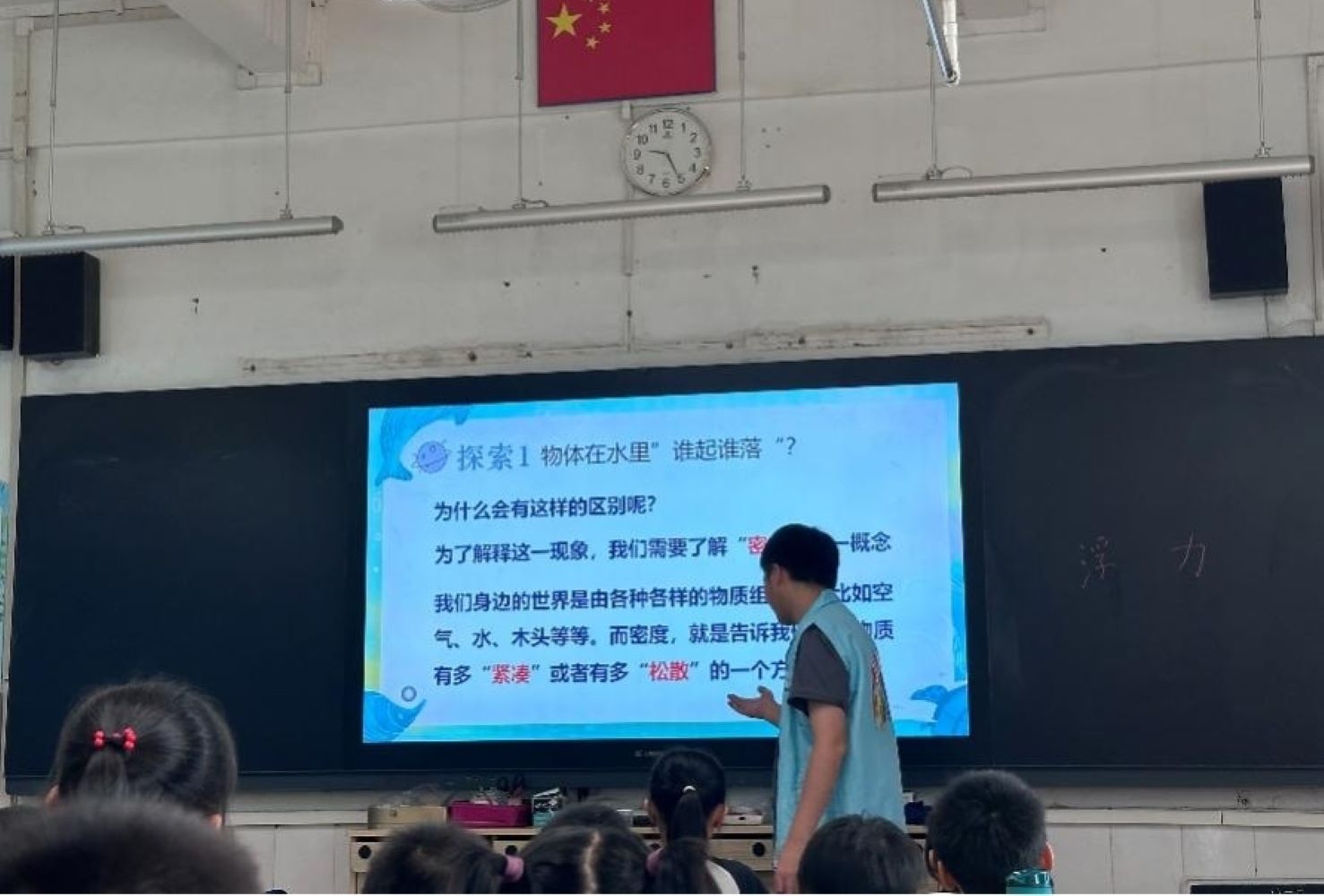 2024年7月21日,在顺德区均安镇星槎小学成长营的教室里,华南师范大学物理学院团委学生会服务队的大王老师以“神奇的液体:探究浮力的奥秘”为题,为孩子们带来了一堂生动有趣的科学课。通过一系列精心设计的实验和讲解,大王老师不仅传授了密度和浮力的基础知识,而且激发了学生们对科学的好奇心和探索欲。