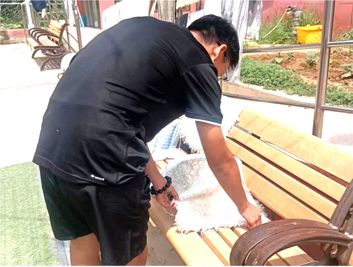 在敬老院中实践团成员发现有很多都是腿脚行动不方便的老人或者生活无法自理的老人,他们的被子、衣服等贴身衣物无法清洗,实践团成员们积极主动承担起为老人整理床铺和清洗衣物的任务,实践团成员们在老人起床后为老人叠叠被子整理床铺,在天气好阳光充足时将被罩、床单简单清洗一下拿到外面进行晾晒,这个任务虽然辛苦但是实践团成员忙碌之后也是收获满满的。