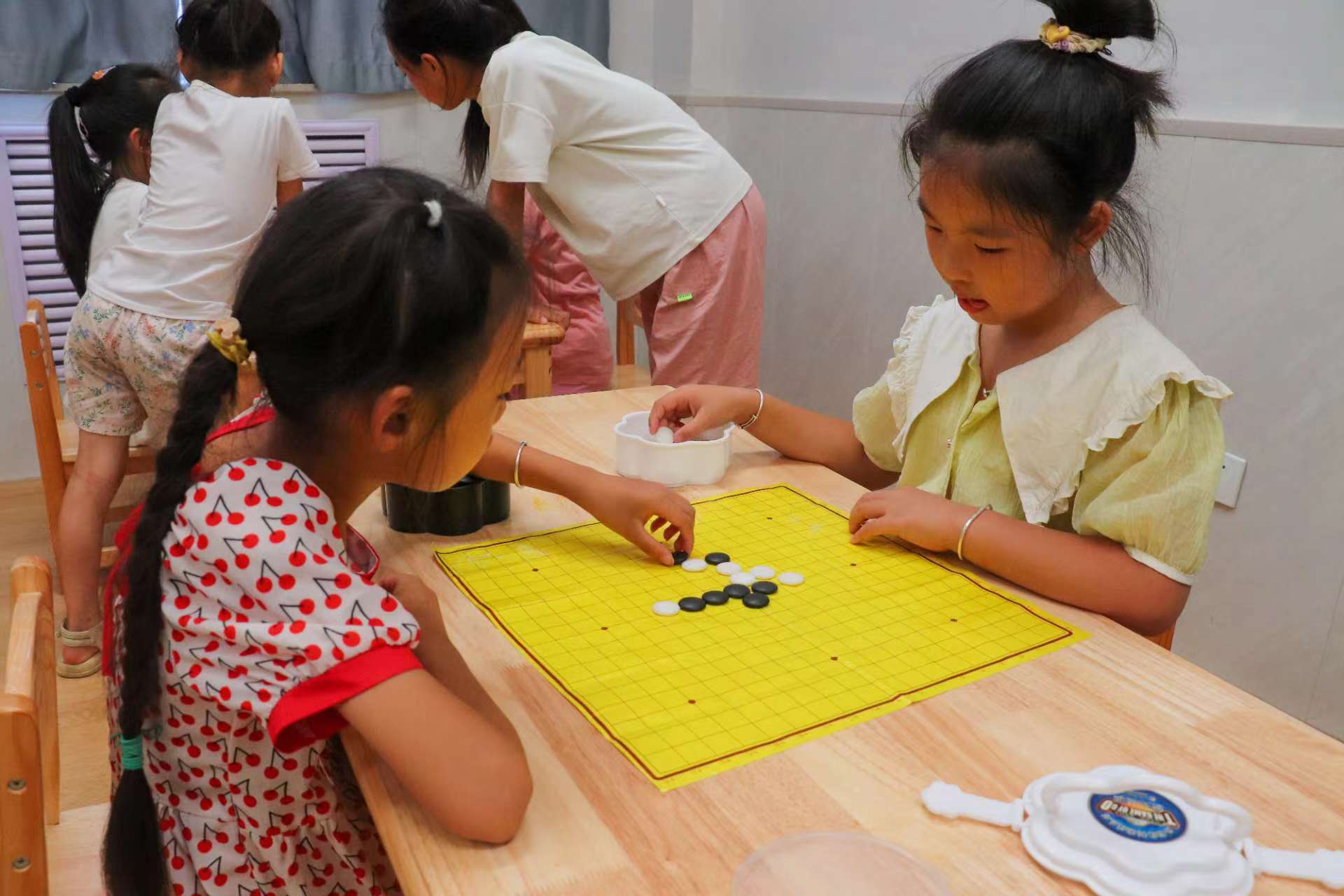午餐过后,实践团的成员们并没有休息,而是迅速转换角色,成为了孩子们的五子棋导师。五子棋不仅锻炼了孩子们的逻辑思维能力,还让他们学会了耐心和策略。每一张棋盘前都围坐着一群聚精会神的小棋手,他们认真思考每一步棋,而实践团的成员则在一旁指导,鼓励孩子们发挥创造力,勇敢尝试不同的走法。