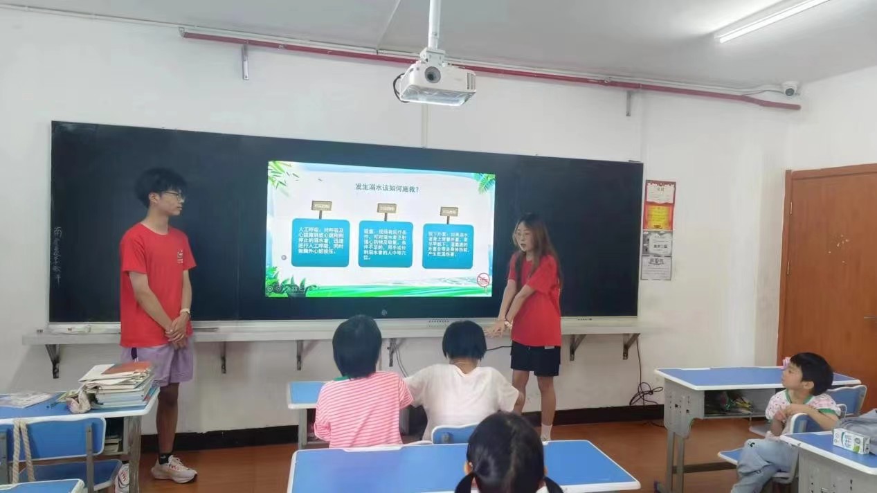 宣讲中,实践队员先以小视频导入,通过PPT演示、真实案例分析,用通俗易懂、生动有趣的语言,传授防溺水知识,帮助小朋友们认识到溺水的危险性和防溺水的必要性,向孩子们强调了防溺水的“六不准”原则、预防与识别溺水隐患以及正确的溺水救护方法。最后,实践队员们亲自演示CPR(心肺复苏术)和人工呼吸的急救技能,教育引导小朋友们增强安全防范意识,提高自救自护的能力。