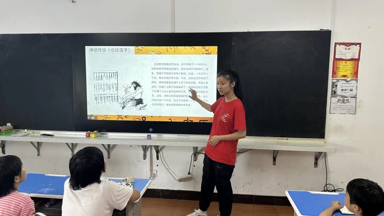图为志愿者在讲解汉字的起源 在宽敞明亮的活动室里,铺满了宣纸,空气中弥漫着淡淡的墨香。孩子们全神贯注地聆听,小心翼翼地尝试,志愿者们耐心地指导,鼓励孩子们自由发挥。随着活动的深入,一幅幅作品逐渐呈现,有的工整严谨,有的天真烂漫,每一张纸上都承载着孩子们的用心和志愿者的温情。