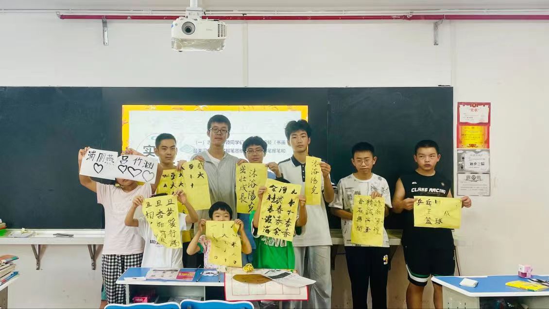 图为小朋友们展示自己的毛笔作品 在此次志愿者服务活动中,实践团成员将防溺水教育与毛笔字艺术创作相结合,不仅能让孩子们获得实用的安全技能,还能在艺术的熏陶中提升个人修养,实现身心的全面发展。